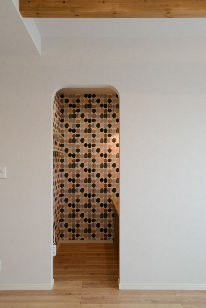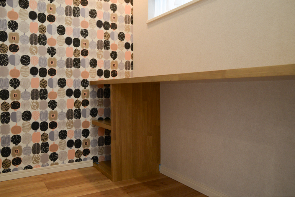 スタディコーナーアーチ壁の奥には、マリメッコクロスが目をひく、スタディコーナー。棚とカウンターを設置し、勉強の他、お仕事や作業スペースにもなる機能的な空間に。遊び心のあるデザインと照明が、居るだけで気分が上がる場所に仕上がりました。(アクセントクロス:サンゲツ MRK3911/カウンター:DAIKEN 集成材カウンター ライトオーカー/固定棚:DAIKEN 集成材飾り棚 ネオホワイト/ペンダントライト:オーデリック OP252893LR) -