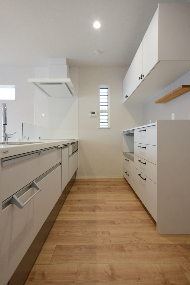 マイスリー「フルフラットキッチン」「キッチンバック収納」全面収納付きのフロートタイプのフルフラットキッチンをご採用いただき、収納力とデザイン性を両立しました。背面のグレージュのクロスがキッチンを引き立たせます。(キッチン・キッチンバック収納:Panasonic Sクラス/扉柄:アースホワイト/レンジフード:ホワイト/キッチンバック収納取っ手:ブラック(MJE)/固定棚:ミディアム塗装) -