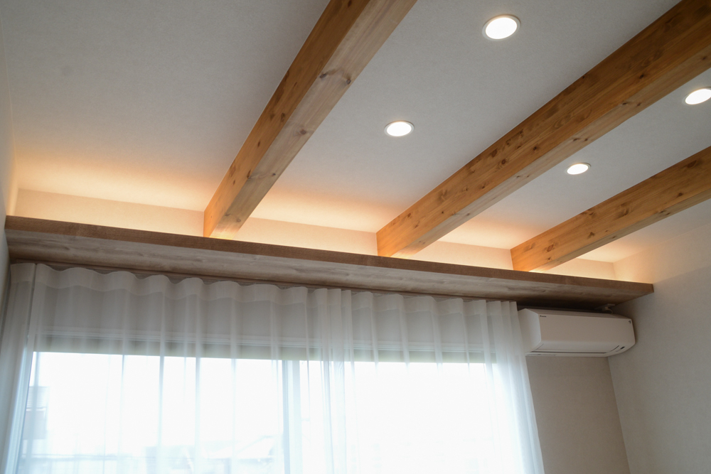 リビング大きな掃き出し窓から光が差し込む、2階リビング。見せ梁と間接照明が、空間に奥行きと温かみをプラス。(見せ梁:ミディアム塗装/下がり天井:サンゲツ FE76581) -