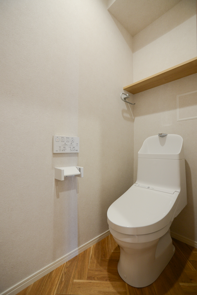 1階トイレ(便器:TOTO ZJ1/固定棚:アートランバー ブライトウォールナット/クッションフロア:サンゲツ HM-12090)