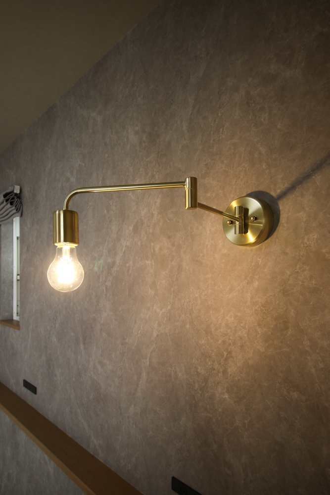 主寝室グレイッシュな大理石調のアクセントクロスで、落ち着きと高級感を演出した寝室。枕元に設けた角度調整ができるブラケットライトは、ゴールドを選定し、上品さをプラス。(フローリング:DAIKEN MYフロア オーク柄エクリュ/アクセントクロス:サンゲツ FE76668/他クロス:サンゲツ SP9733※廃盤/シーリングライト:コイズミ AH55997/ブラケットライト:オーデリック OB255343LC) -