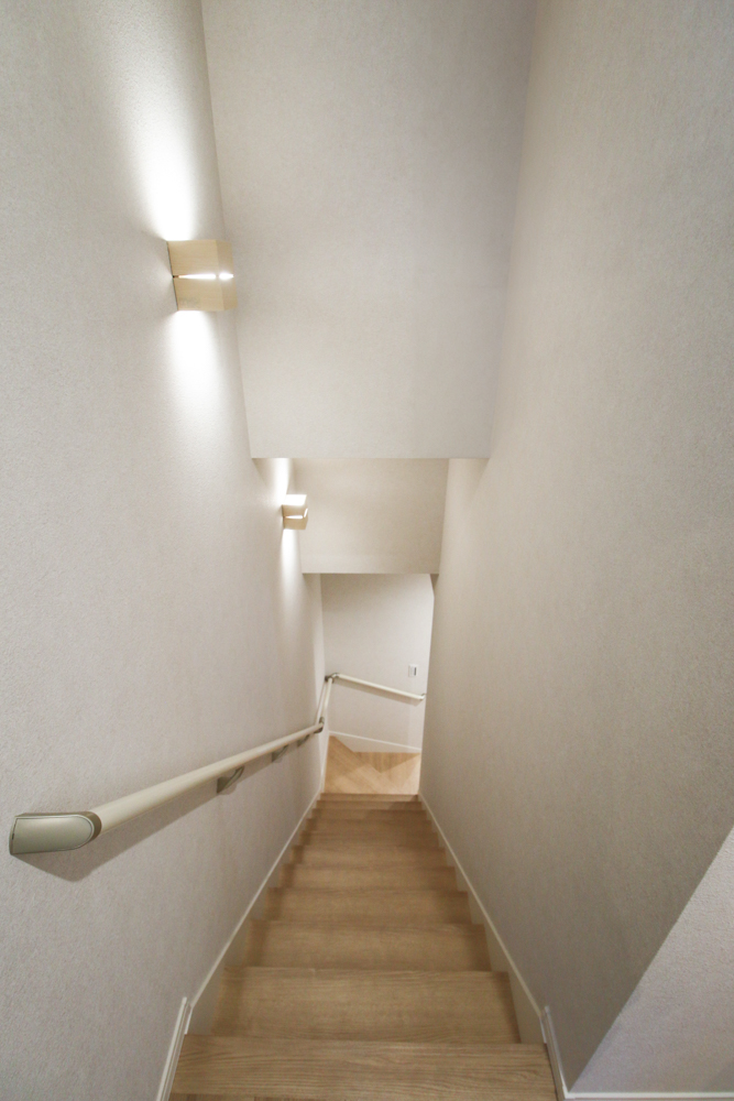 階段(DAIKEN トリニティ階段/踏み板:チェスナット柄/蹴込み・側板:モノホワイト/手すり:ネオホワイト/金具:シルバー)