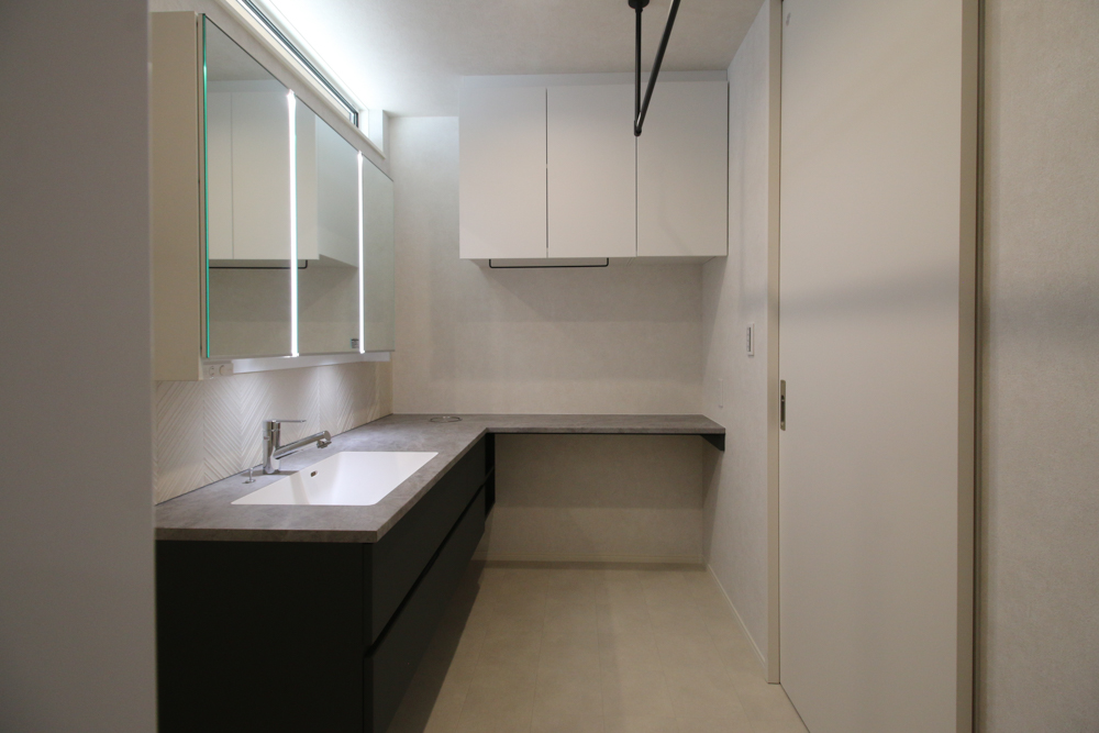マイスリー「オリジナル造作洗面」フロートタイプの造作洗面と一体型の広いカウンターを組み合わせた、L型の洗面台。カウンター上には収納を設け、洗濯、干す、畳む、収納の動作を楽にしてくれる工夫が詰まっています。(天板:アイカ JIT10125KN74/造作収納:アイカ工業 メラミン TK-6607K/タイル:平田タイル Gubi GUB-3090WPE-9T/正面クロス:サンゲツ FE76659/他クロス:サンゲツ FE76656/クッションフロア:サンゲツ HM-12024/ミラー:Panasonic シーライン W1200/タオル掛け:ミラタップ トゥーボ BA11051/上部収納:LIXIL ヴィータス プレシャスホワイトP アイアンバー後付) -