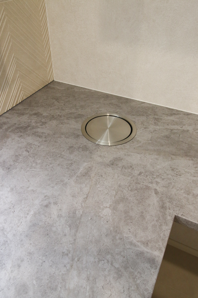 システムバスルーム洗面脱衣室のホテルライクな空間にマッチする、大柄でコントラストのある石目柄が目をひくバスルーム。(システムバス:TOTO サザナ 1717サイズ/アクセントパネル:サバナグレー/周辺パネル:プリエホワイト/床:ホワイトラグ調) -