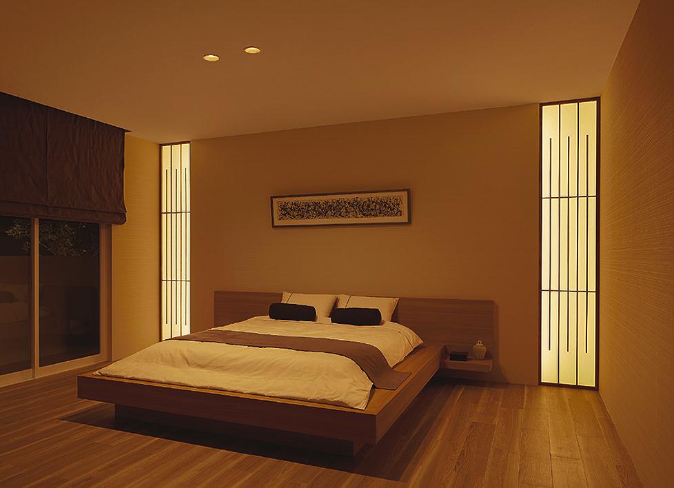 落ち着いた雰囲気になるように眩しすぎない間接照明や、電球色のスタンドライト等を採用する事で快適な睡眠環境をサポートします。
