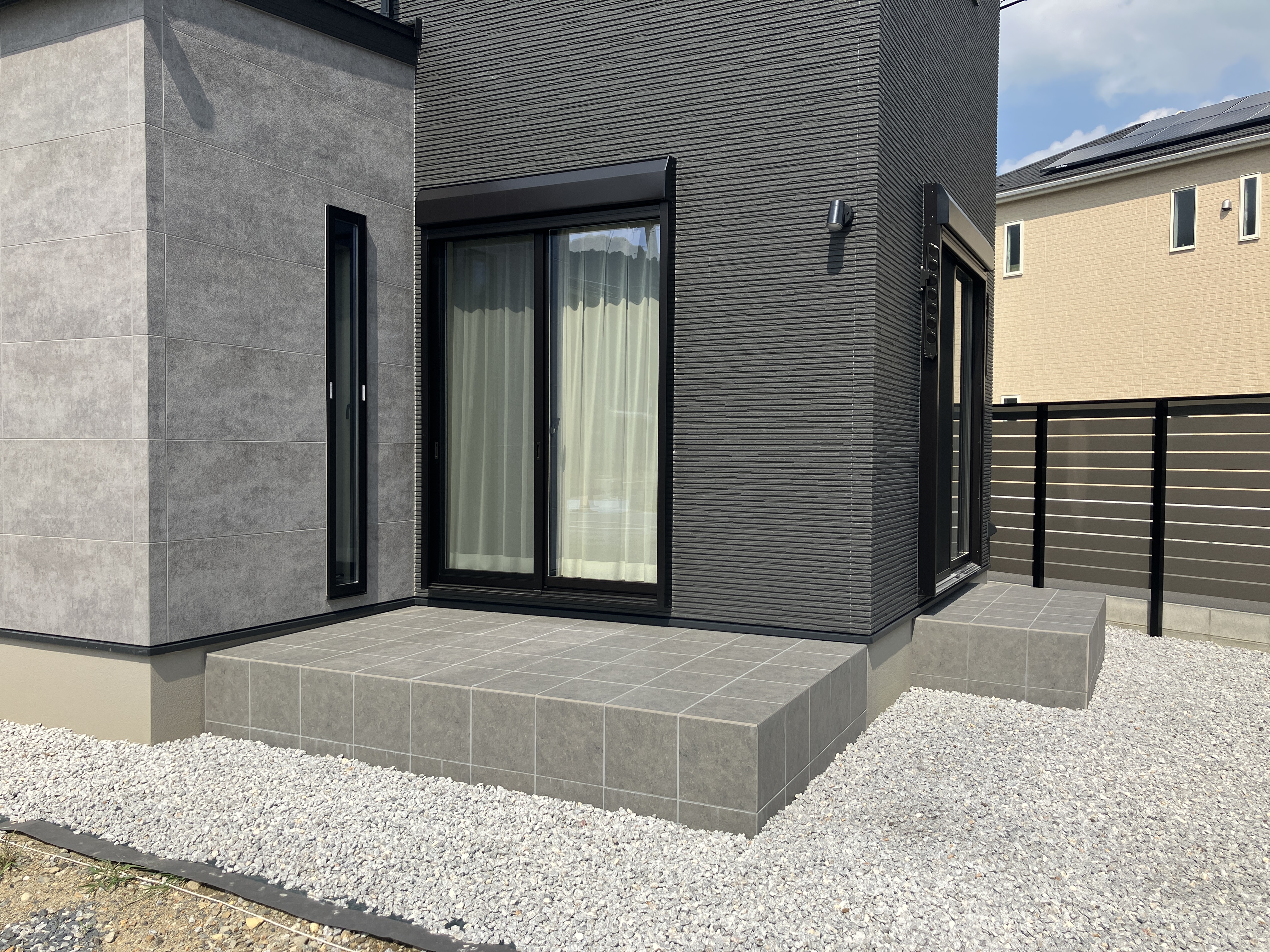 (外壁メイン:KMEW ハーモレイド NH5204U QFブリュレチタンブラック/外壁アクセント:KMEW フィエルテ NH49711A QFフィエルテチタンダークコンクリート/屋根:ガルバリウム鋼板 ジェットブラック/破風板:神島化学工業 チャコールブラック/軒天井:神島化学工業 チャコールブラック/サッシ:YKKap エピソードⅡ カームブラック/玄関ドア:YKKap ヴェナートD30 FⅡN カラー24 /玄関タイル:東洋石創 TZ-411G) -