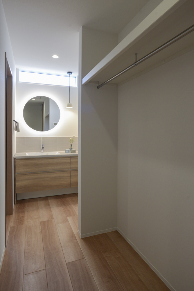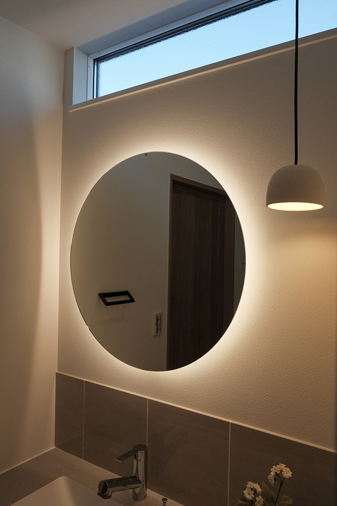 マイスリー「オリジナルコーディネート洗面」間接照明付きのスタイリッシュなミラーが印象的な洗面空間。グレージュのタイルがモダンな雰囲気を演出し、おしゃれなペンダントライトが空間のアクセントに。洗練されたデザインで毎日の身支度が楽しくなる空間です。