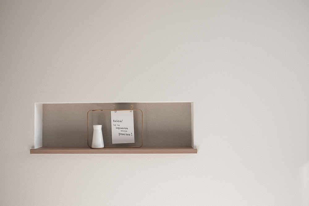 (ホール収納:アイカ工業 特注収納 面材JC-516K フロート納まり/ウッドパネルアイカ工業 リブ化粧材:キャニオン OC516) -