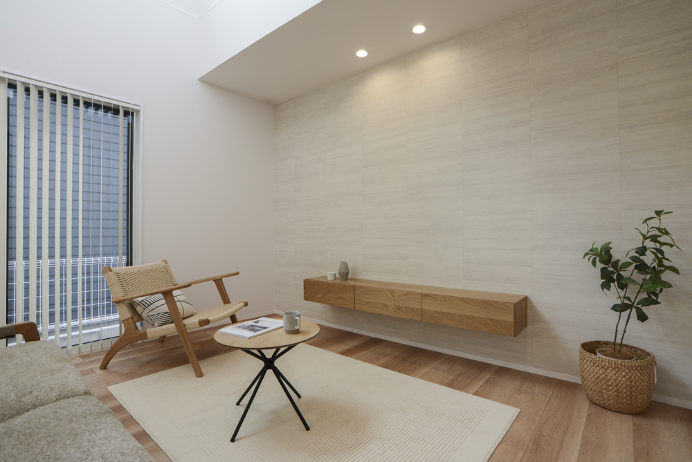 玄関ホール木目のアクセントウォールが印象的な玄関ホール。シンプルな白い壁に木の温かみが映え、お客様を迎える心地よい空間に。フロート収納は玄関まわりをすっきりと整理でき、機能性とデザイン性を兼ね備えた工夫です。