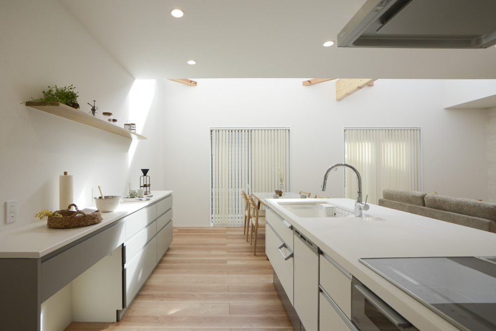 マイスリー「フルフラットキッチン」存在感あるスタイリッシュなフルフラットキッチン。白を基調としたシンプルなデザインで空間全体に開放感をもたらします。使いやすさとデザイン性を兼ね備え、家族とのコミュニケーションが弾みます。