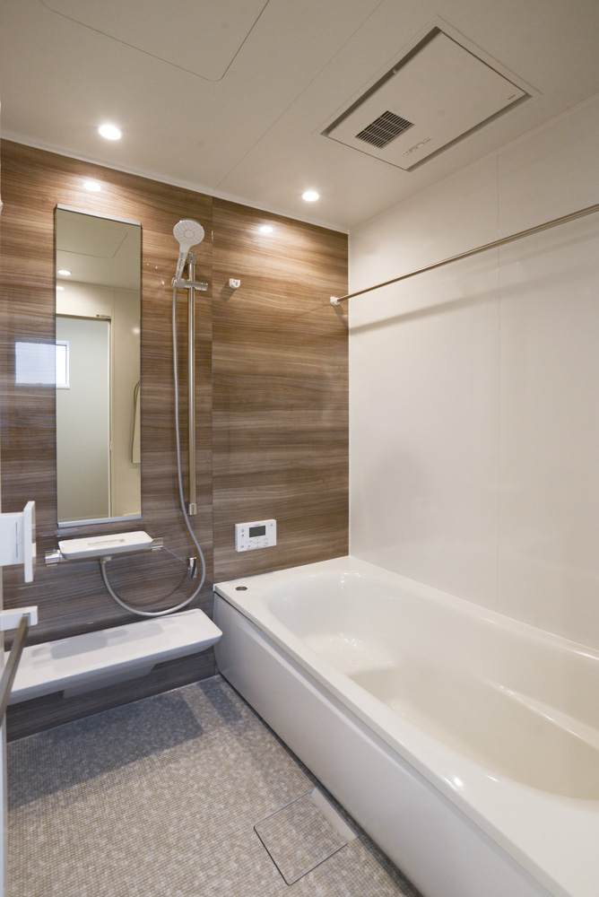 バスルーム(TOTO サザナ アクセントパネル:ノルディグレーウッド/床:ライトグレーラグ調/IoT対応おそうじ浴槽))