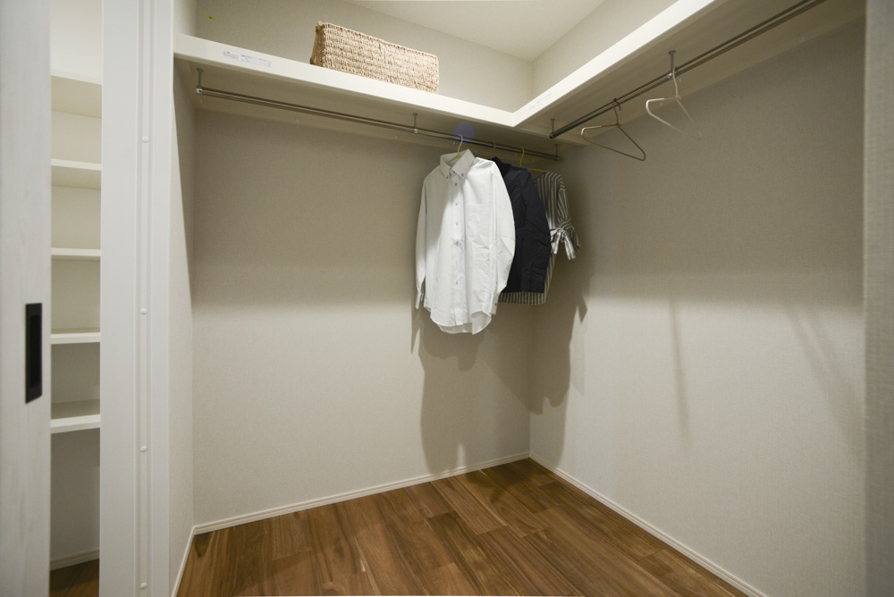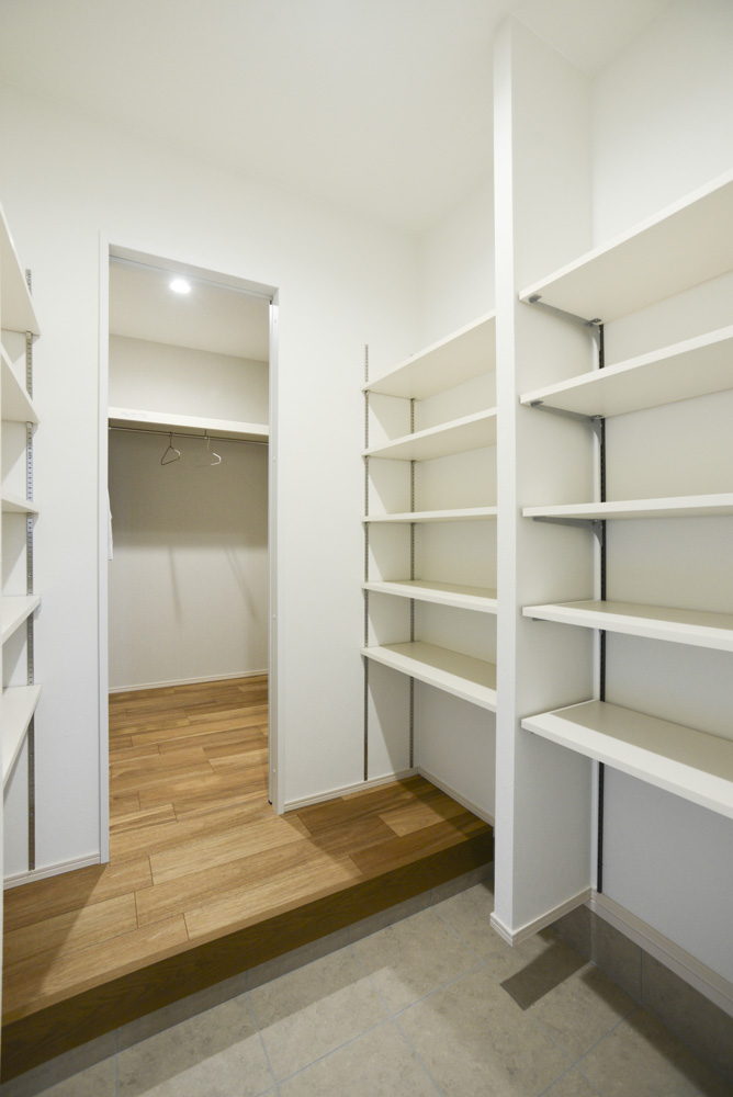 玄関ホールホワイトのクロスと温かみのある突板の床材のコントラストが映える玄関ホール。正面からウォークインクローゼットにアクセスできる、日々の生活を意識した快適な動線に。 (床:NODA ラスティックフェイスリッチJベース アカシア/メインクロス:sangetsu SP2507) -