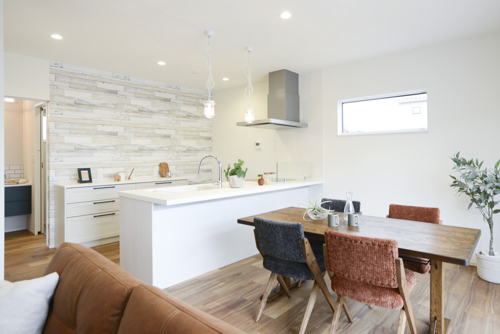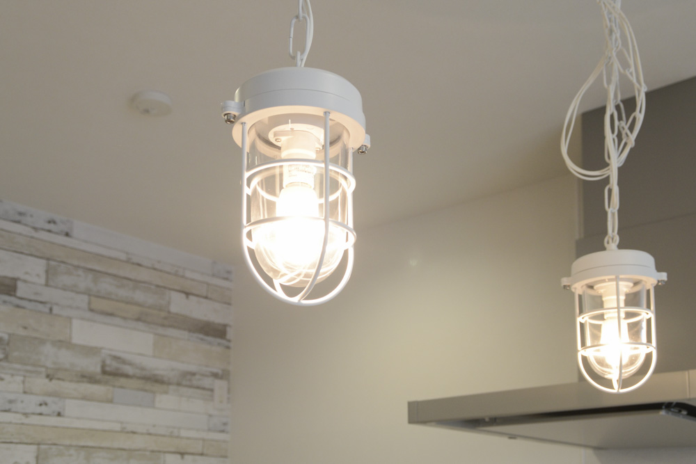 マイスリー「フルフラットキッチン」ホワイトアッシュの上品な色合いと、木目の温もりが心地よさをもたらすキッチン。柔らかな空間の中にマリンランプをアクセントとして添え、カフェのような空間を演出。 (キッチン:Panasonic Sクラス/扉色:ホワイトアッシュ/カウンター:人工大理石 グラニュールホワイト/取っ手:ハンドルブラック/レンジフード:スクエアサイドフードSタイプ/ペンダントライト:ODELIC OP252408LR) -