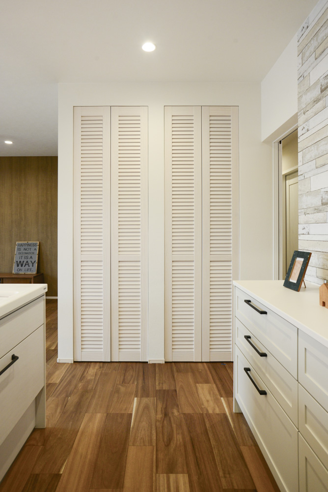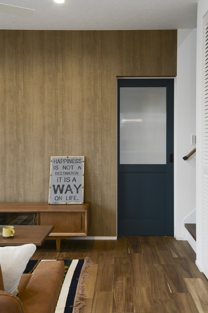LDK18帖のLDKは掃き出し窓から光が差し込む明るく開放的な空間。木目のクロスとディープグリーンのリビングドア、無垢材のホワイトカラーの収納扉が木の温もりを感じさせるカリフォルニアスタイルに仕上がりました。 (リビングドア:WOODONE ピノアースオーダーペイントドア P-VN型 ディープグリーン/アクセントクロス:sangetsu FE76584/収納建具:WOODONE ピノアース N-LX型 ホワイト) -
