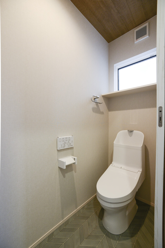 1階トイレホワイトを基調とした空間にグリーンのクロスをコーディネートし、アクセントをプラス。床材とカウンターのトーンを合わせ、ナチュラルな風合いのトイレ空間を演出します。