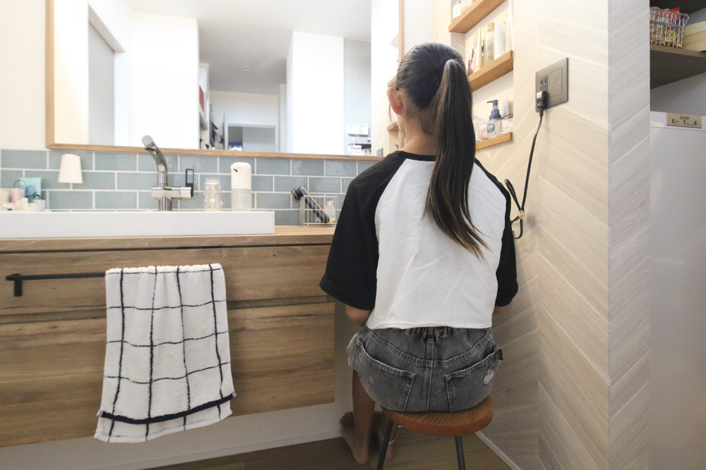 大きい鏡があって見やすいし、自分の物がしまえるから。