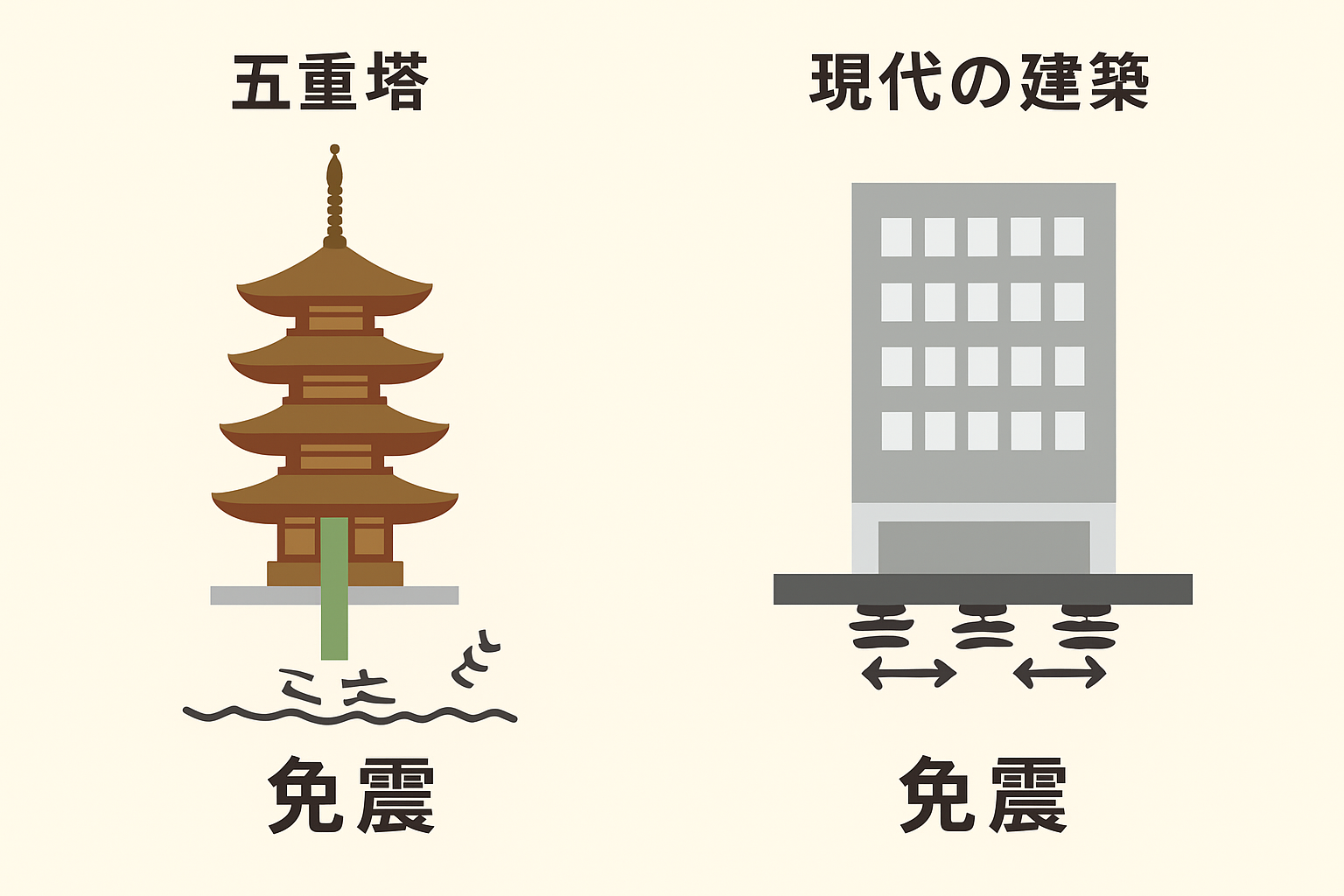 現代建築での免震は、建物と地面の間に装置を置いて揺れを伝えない仕組みですが五重塔では 心柱と各層の構造が免震に似た働きをします。