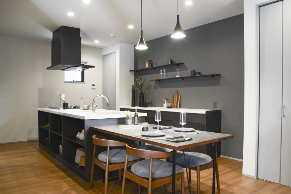 深みのあるグレーを基調とした室内は、チェリーの床が温もりと彩りを添える大人のためのモダンな住まい。