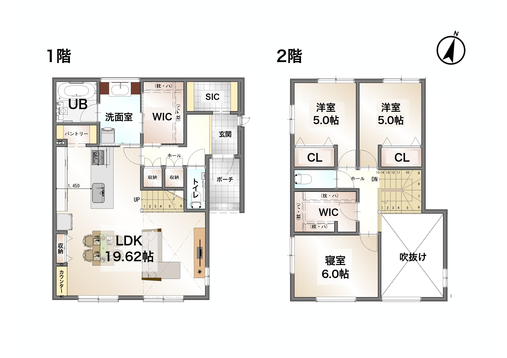 吹抜けの開放感が広がる19帖のリビングは