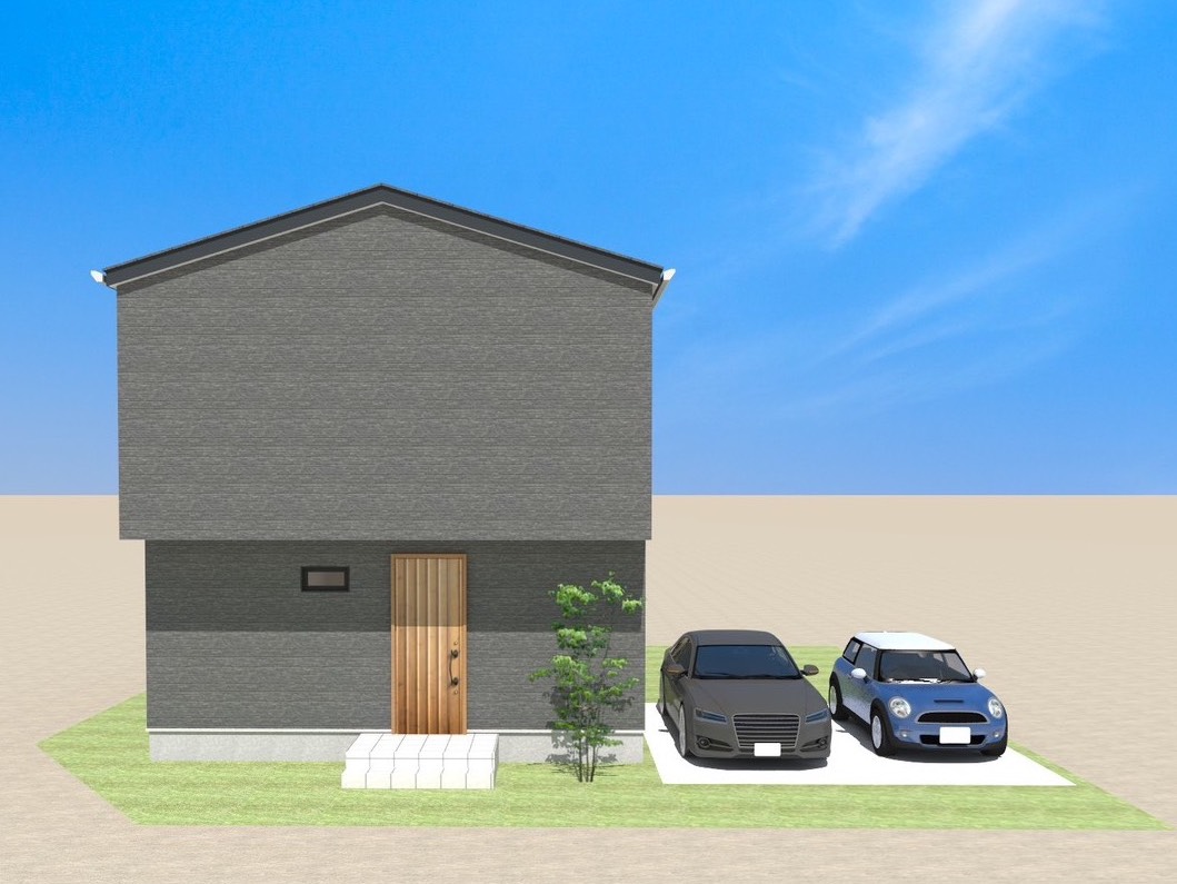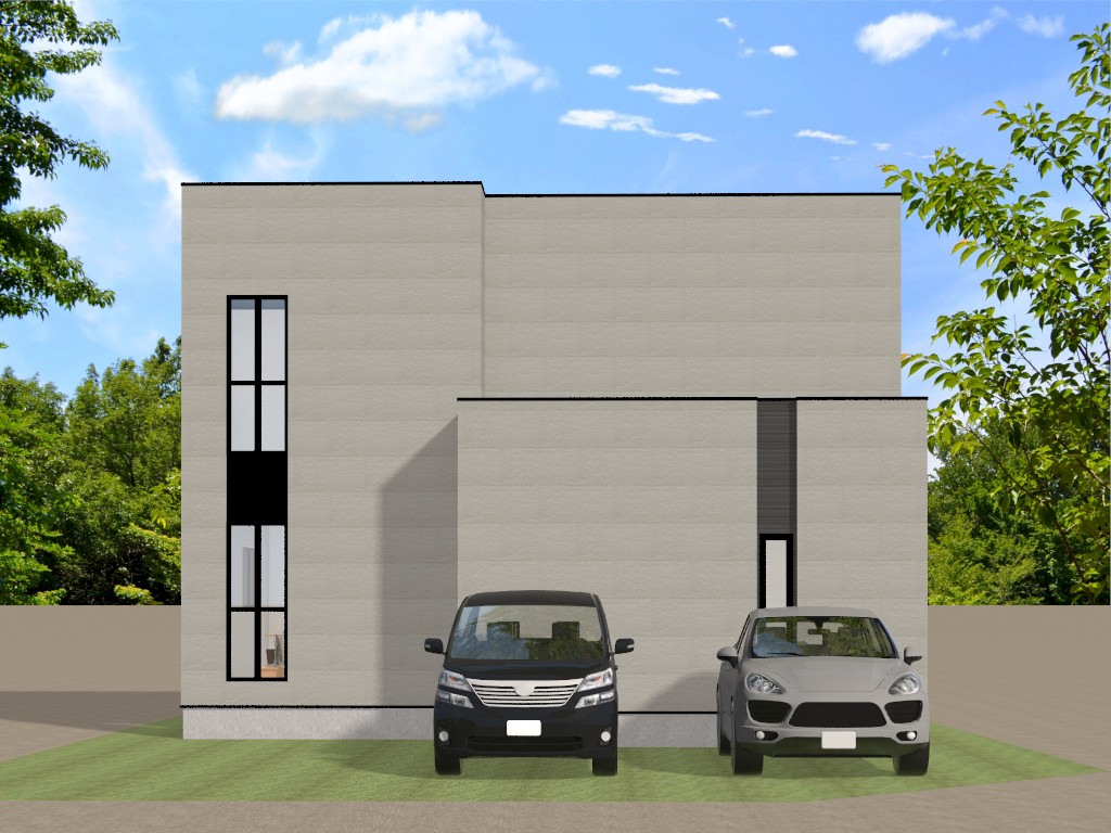 切妻屋根に立体感のあるスリットデザインが効いたモダンな外観。