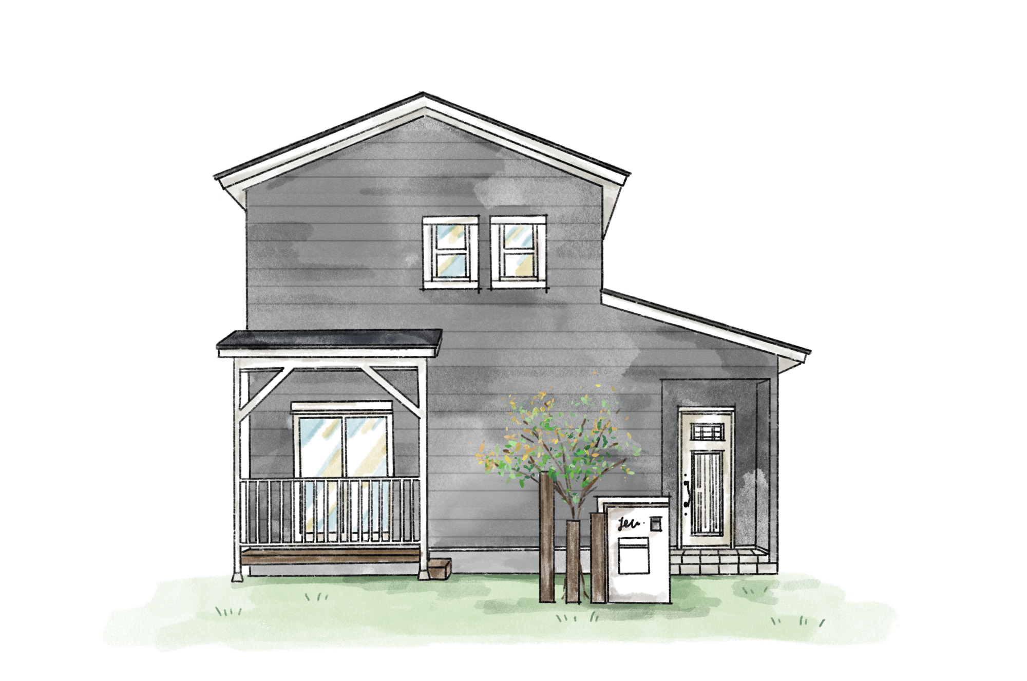 グレーとホワイトが織りなすシャープな片流れ屋根のフォルム。