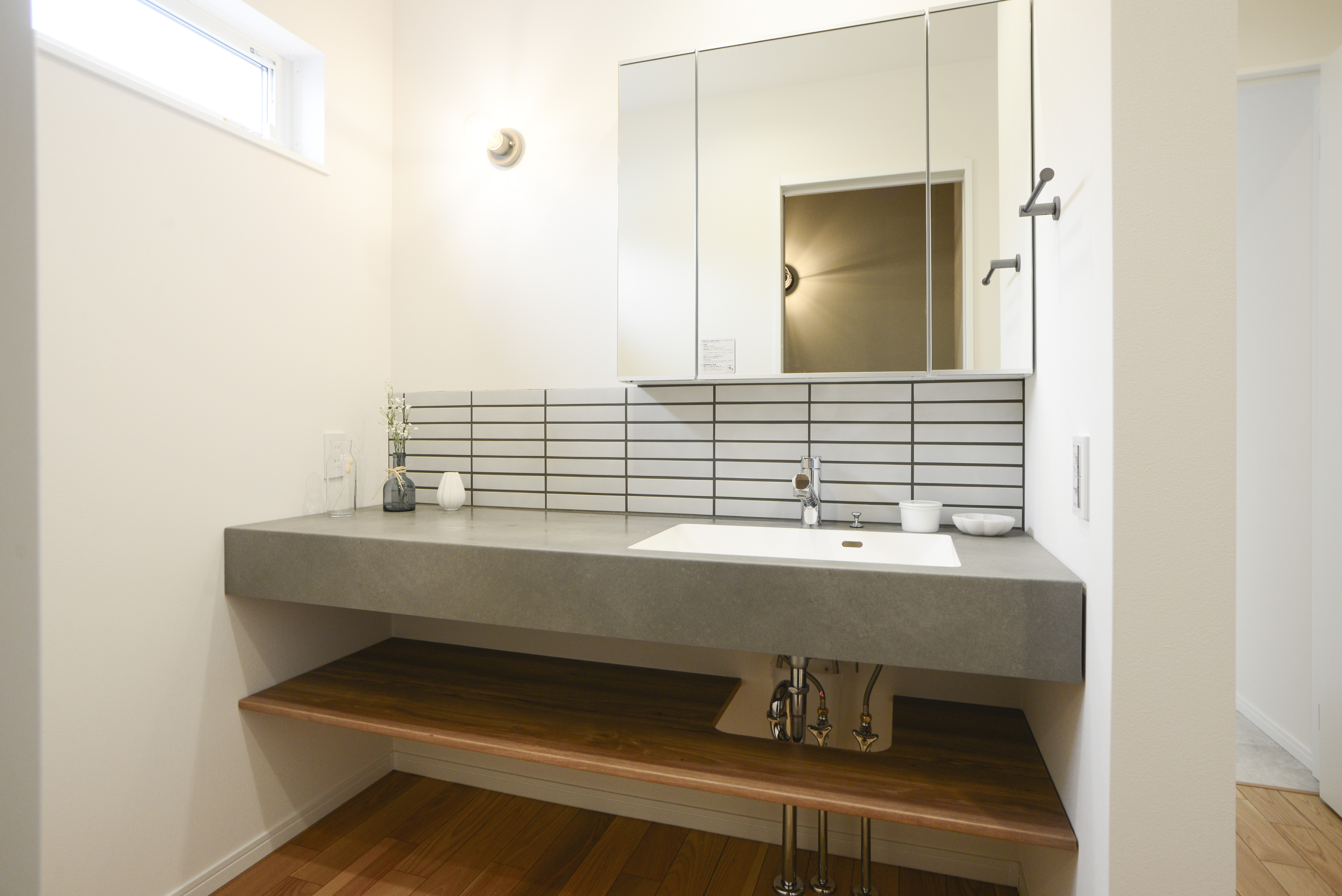ホワイトのタイル柄や、コンクリート調のアクセントをプラスして
