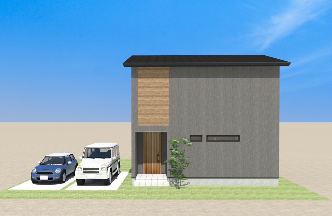 温かみを感じるウォームグレーの外観は片流れの屋根でシンプルに。