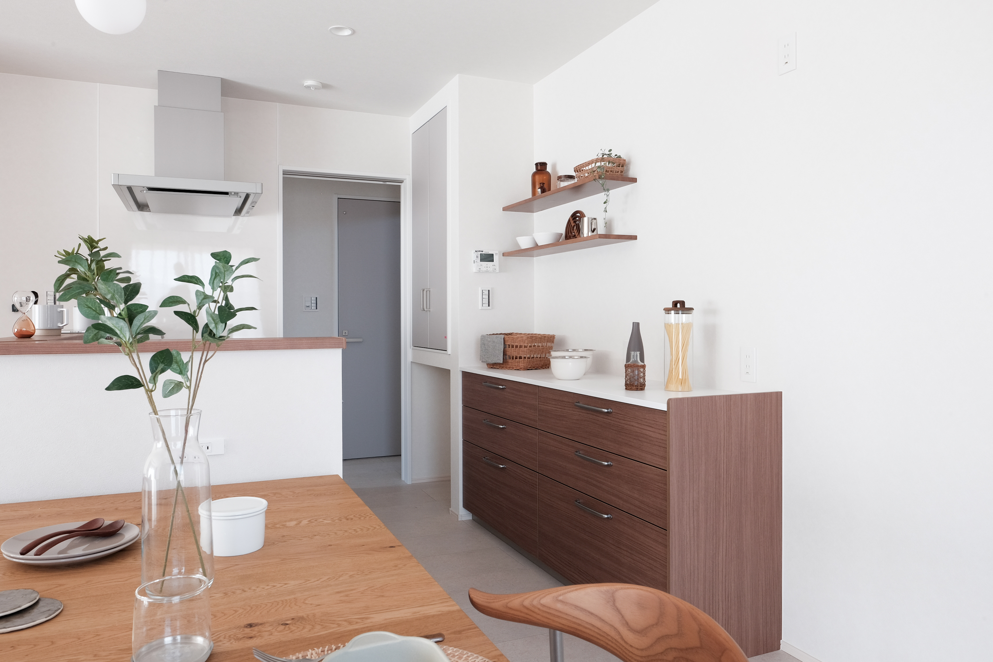 爽やかなホワイトベースの室内に、突板の豊かな木目と無垢建具が自然の温もりを添えています。