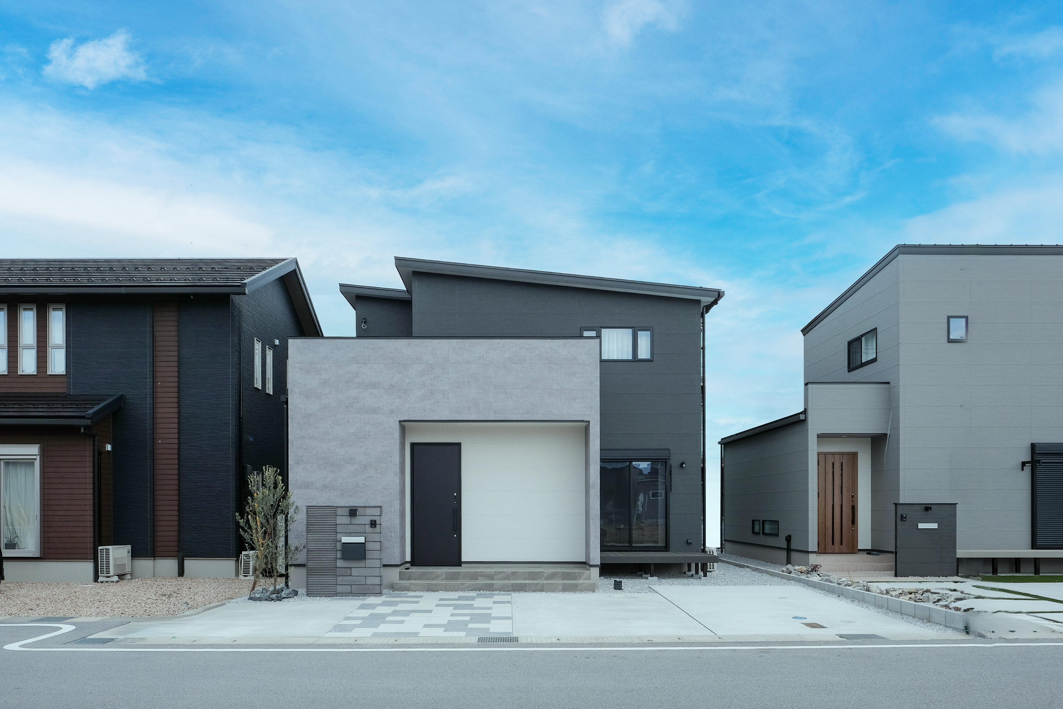 グレーとホワイトが織りなすシャープな片流れ屋根のフォルム。