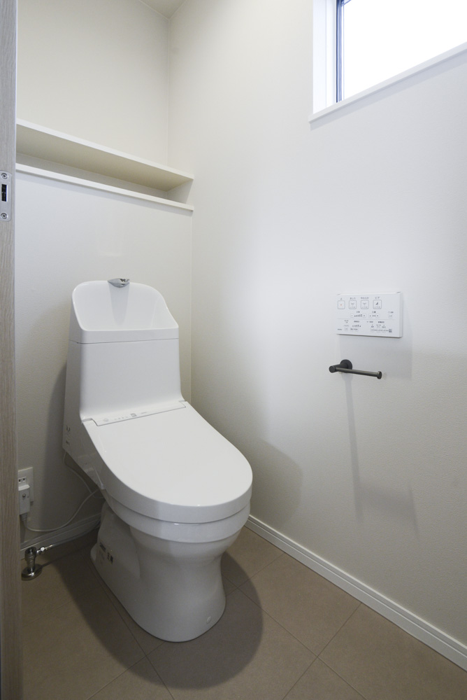 1階トイレグレージュ・木目・ホワイトが織りなす心地良い雰囲気のトイレ空間。