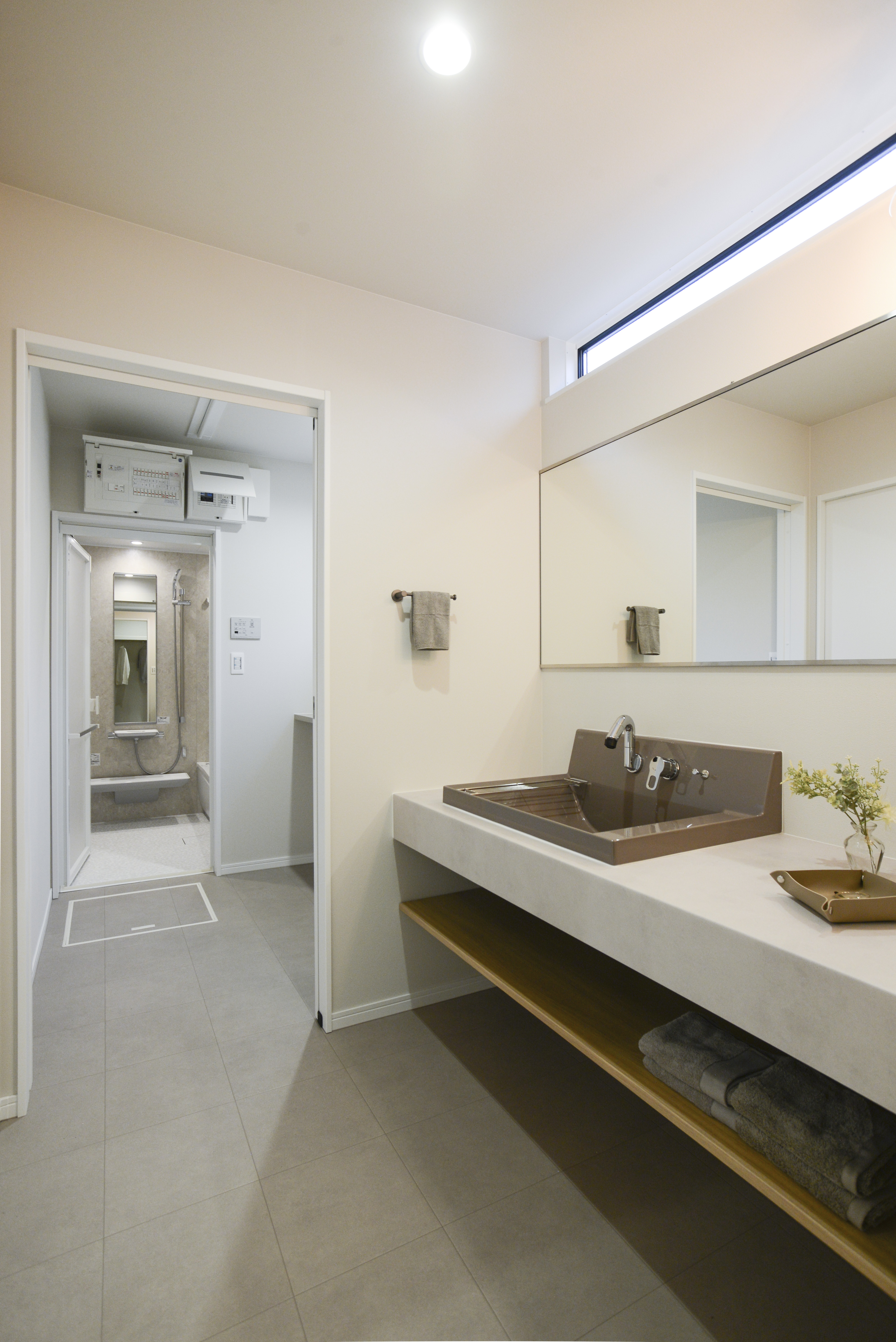 (洗面台:LIXIL カスタムバニティ カウンター:シマンホワイト 下棚:クリエオーク 洗面器:プレーントープ/鏡:TOTO フリーサイズ大型鏡 2方フレーム仕様/クロス:サンゲツ SP-2532/クッションフロア:サンゲツ HM-12016/照明:DAIKO DPN-41369Y/タオル掛け:ミラタップ トゥーボ ブラストグレー) -