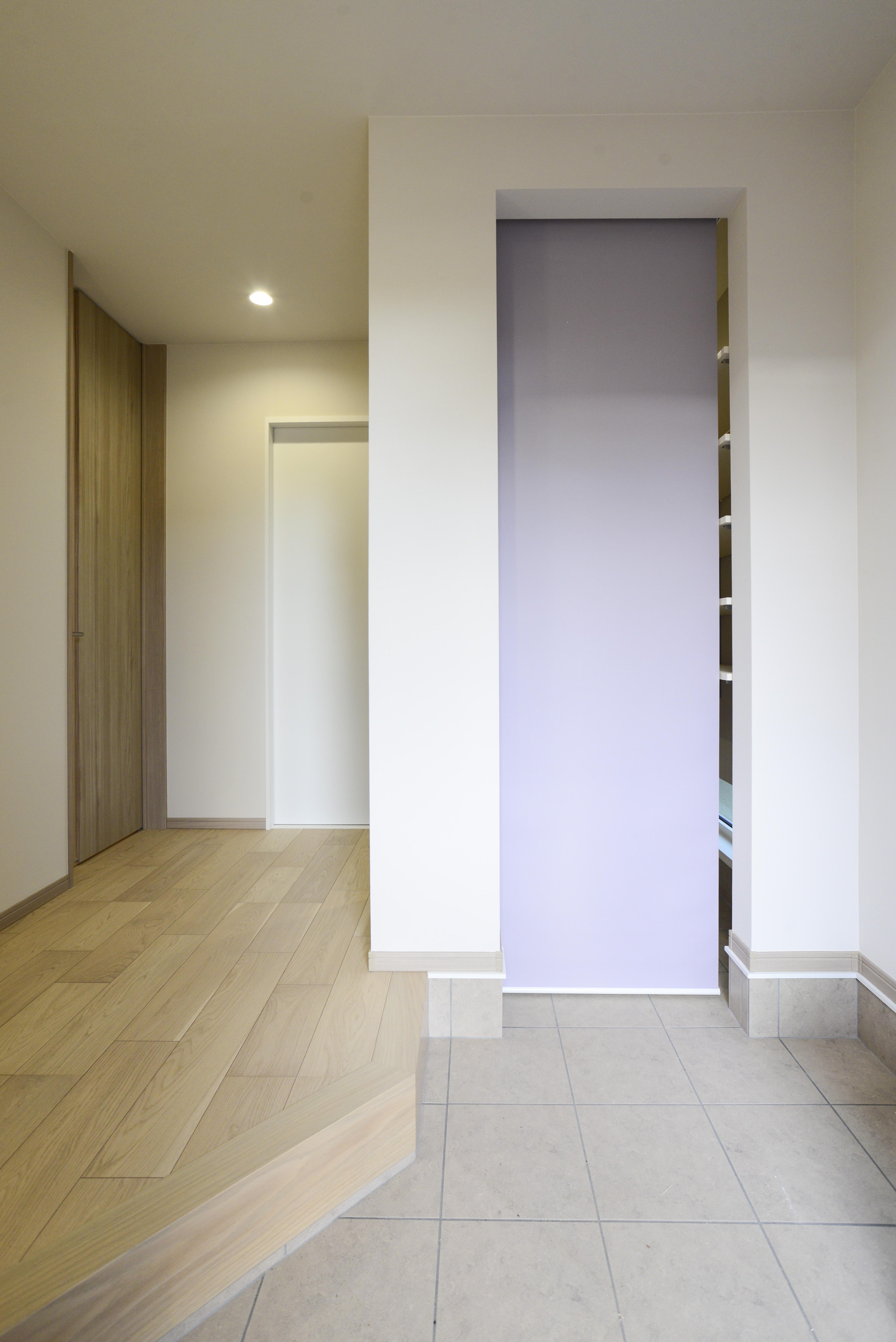 玄関ホール上がり框を斜めに設けた奥行きのある玄関ホール。ハイドアや雫をモチーフとしたペンダント照明が空間を上品に彩ります。
