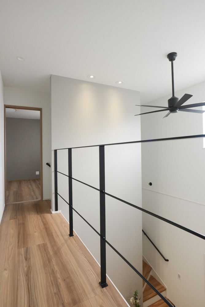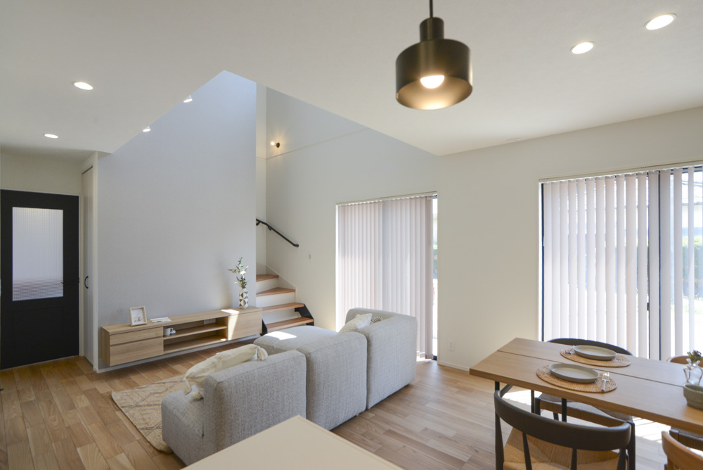 マイスリー「ハイグレーフローリング」突板のぬくもりを感じるフローリングや家具で、リラックスできる心地よいリビング空間に。スケルトンのアイアン階段が、空間に軽やかさをプラスし、日々の暮らしをおしゃれに彩ります。