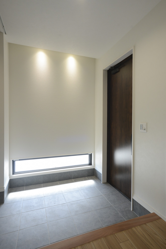 シューズクローゼットの扉はハイドア仕様で、レールを天井に埋め込みました。スッキリした印象の玄関に。