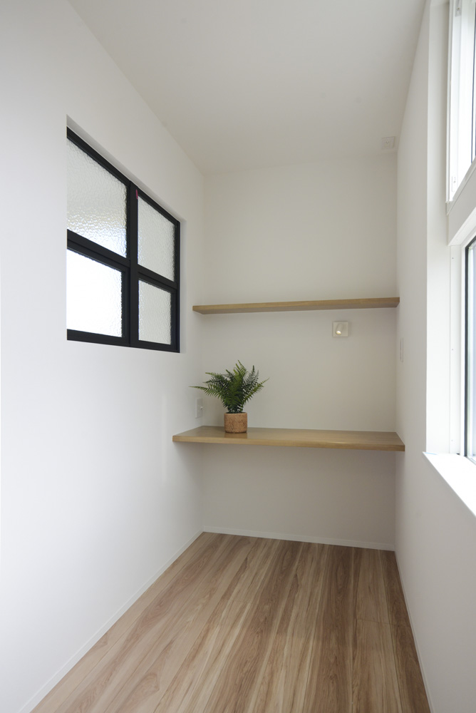 スタディスペース寝室の一角に設けたスタディスペース。おしゃれなデコ窓はLDKの吹抜けにつながり、家族の気配を感じながら作業や読書ができる空間です。限られたスペースを有効活用した、居心地の良いワークスペースに仕上がりました。