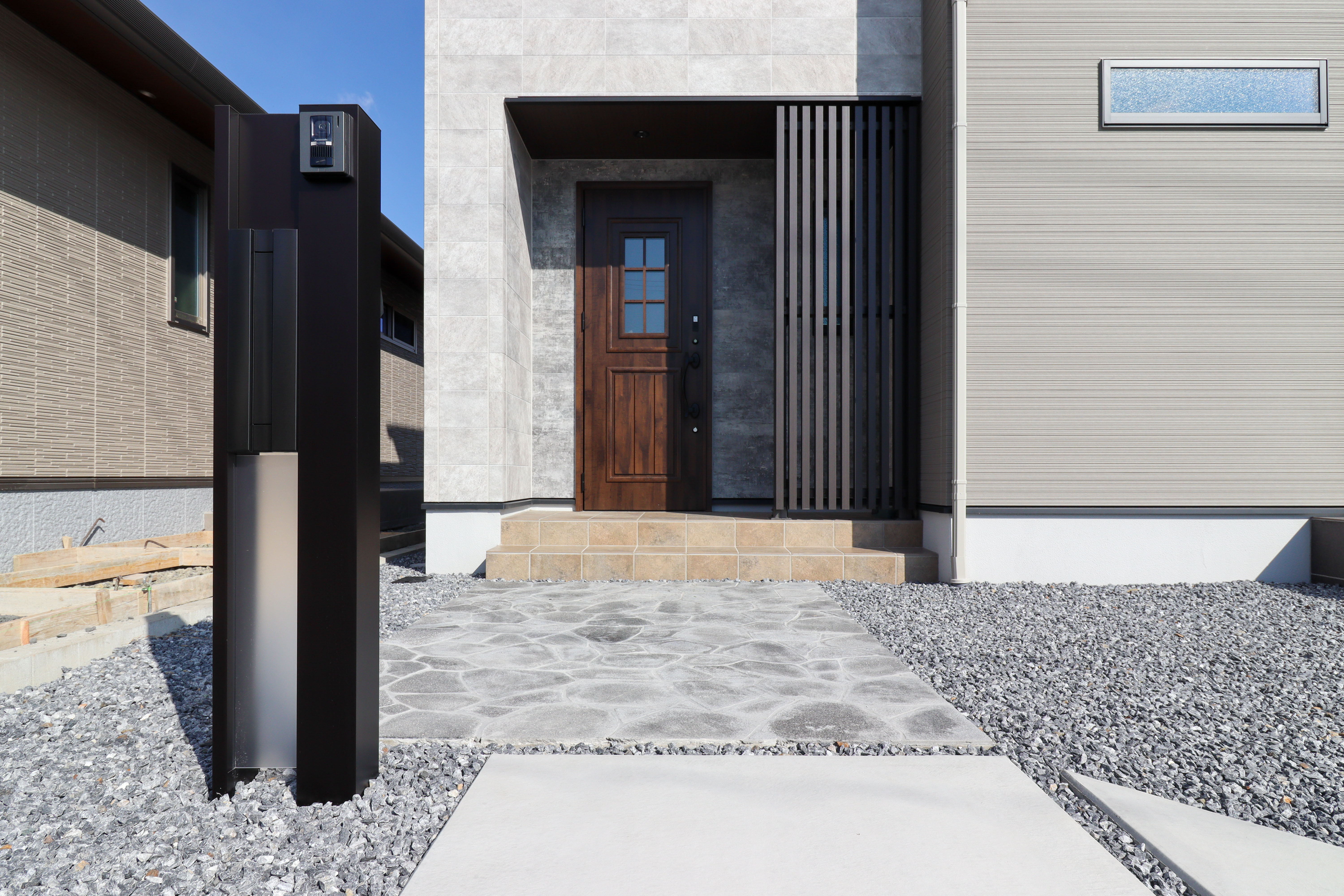 大人かっこいい×ナチュラルテイストのお家ウォームグレー色をメインにホワイト系のストーンタイル、コンクリート調の外壁を合わせ、スマートながらも柔らかな印象も兼ね備えた外観。(メイン外壁:KMEW 光セラ18 シュトラール18 シルクチタングレー NH5794K/アクセント外壁①:KMEW 光セラ ストーンタイル ストーンチタングレー NH7512A/アクセント外壁②:KMEW 光セラ グラフィル グラフィルチタンダークグレー NH7442A/破風板:神島化学工業 チャコールブラック/軒天井:ニチハ 木目調 ダーク ML673V/サッシ:LIXIL サーモスⅡ-H ブラック/玄関ドア:LIXIL ジエスタⅡ K4仕様 C12型 アンティークオーク/ドアハンドル:D型 シルキーマットブラック/アルミ格子:三協アルミ メイクファード メイクスクリーンⅡ ビターグレイン/ポーチタイル:SWANTILE TChic モーリス MAU-3) -