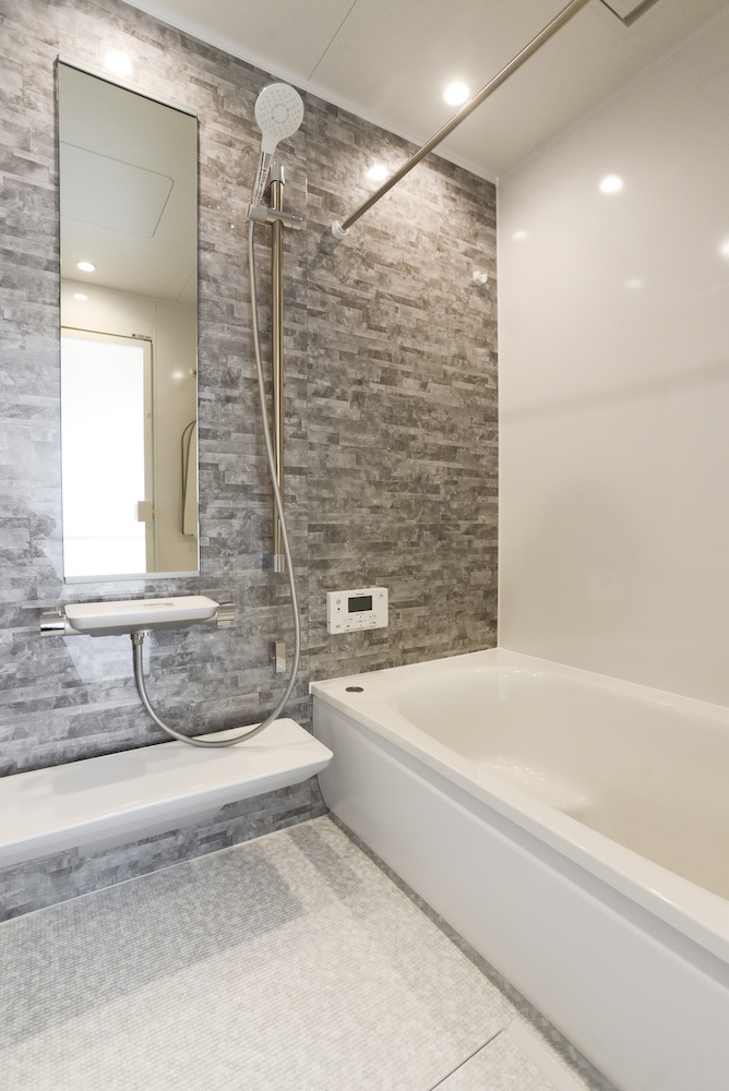 バスルーム (TOTO サザナ Tタイプ アクセントパネル:クレアライトグレー 周辺パネル:プリエホワイト 床:ホワイトラグ調)