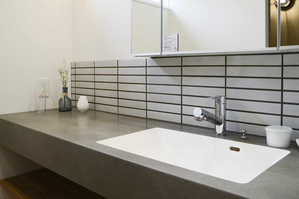 横幅を広く取ったカウンターは、家族が二人並んでも余裕を持って身支度ができる広さ。グレーのコンクリート調の天板とタイルを組み合わせた洗練されたデザインが、朝のモチベーションを高めてくれます。カウンター下のオープン収納は、タオルや着替えをサッと取り出せる「見せる収納」として機能し、家事の時短にも貢献します。