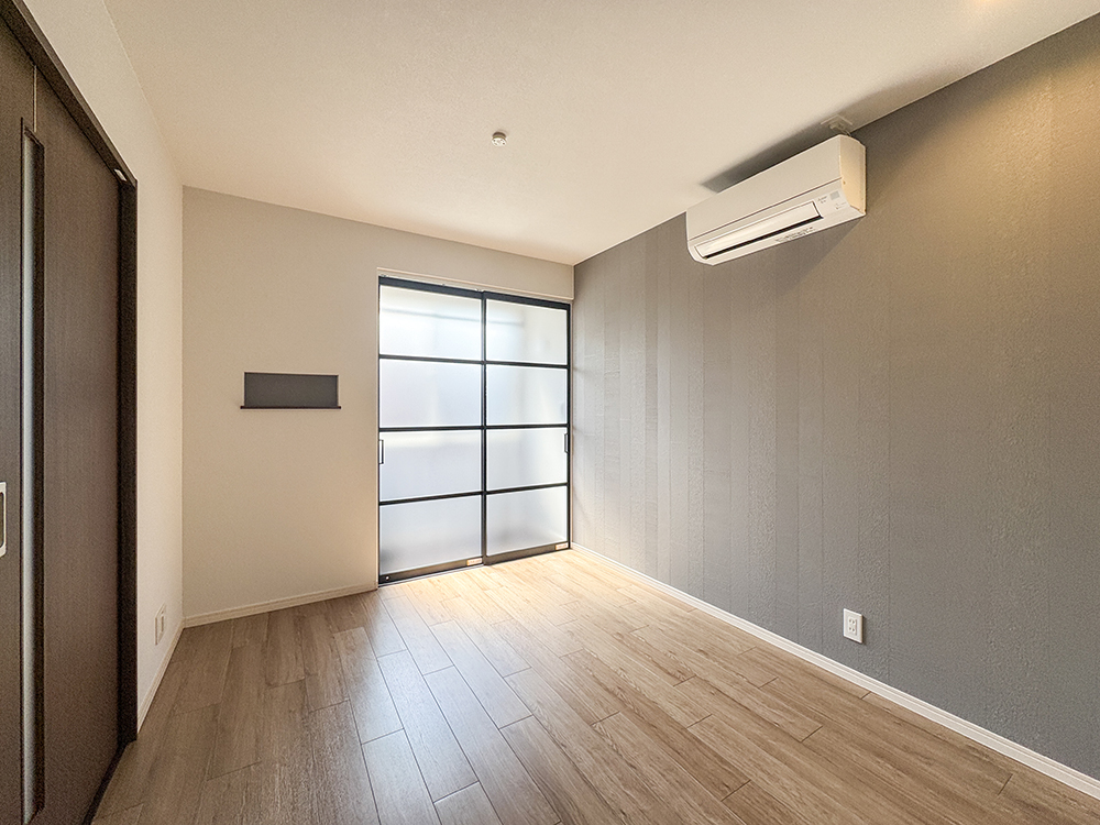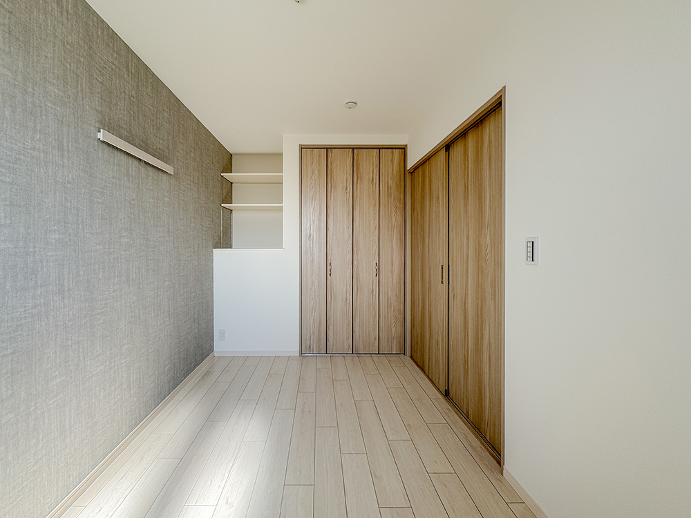 202号室 洋室クローゼットに加え、使い勝手の良いオープン収納とハンガーラックを設けた洋室。壁面を有効活用し、洋服や小物の一時掛けにも便利です。