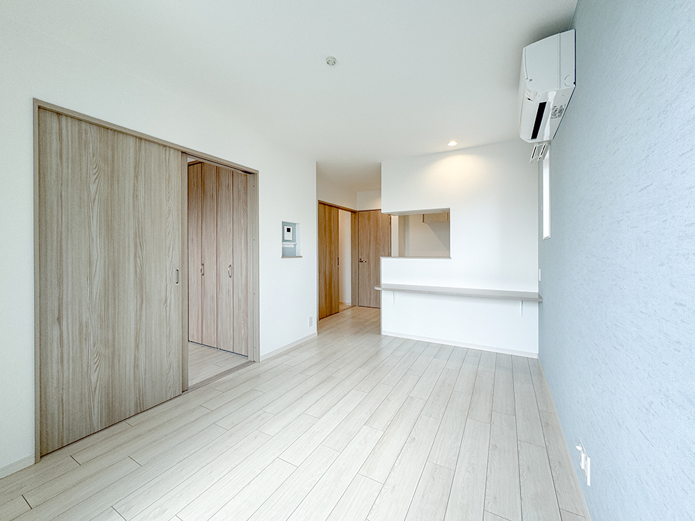 LDK(202号室:モダンスタイル) ※102号室も同スタイル明るい木目のフロアと清潔感のある白壁に、落ち着いたグレーのアクセントクロスが調和する、洗練されたLDK。キッチンの前面には、PC作業や読書に最適なカウンターを設けました。壁面を有効活用したリモコンニッチなど、生活感を抑え、スッキリと整った暮らしを叶えます。
