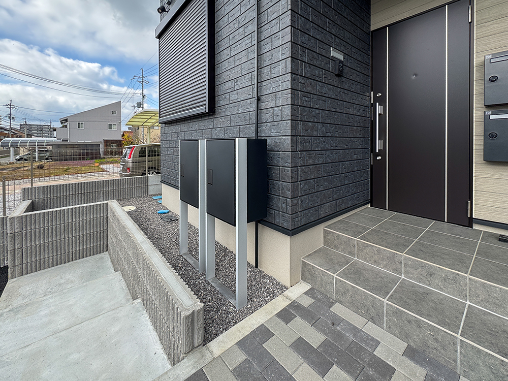 玄関アプローチグレーの濃淡を組み合わせたインターロッキングが、都会的で洗練された玄関アプローチを演出します。全戸に専用の宅配ボックスを完備し、外出中でも荷物を受け取れる、利便性を実現しました。