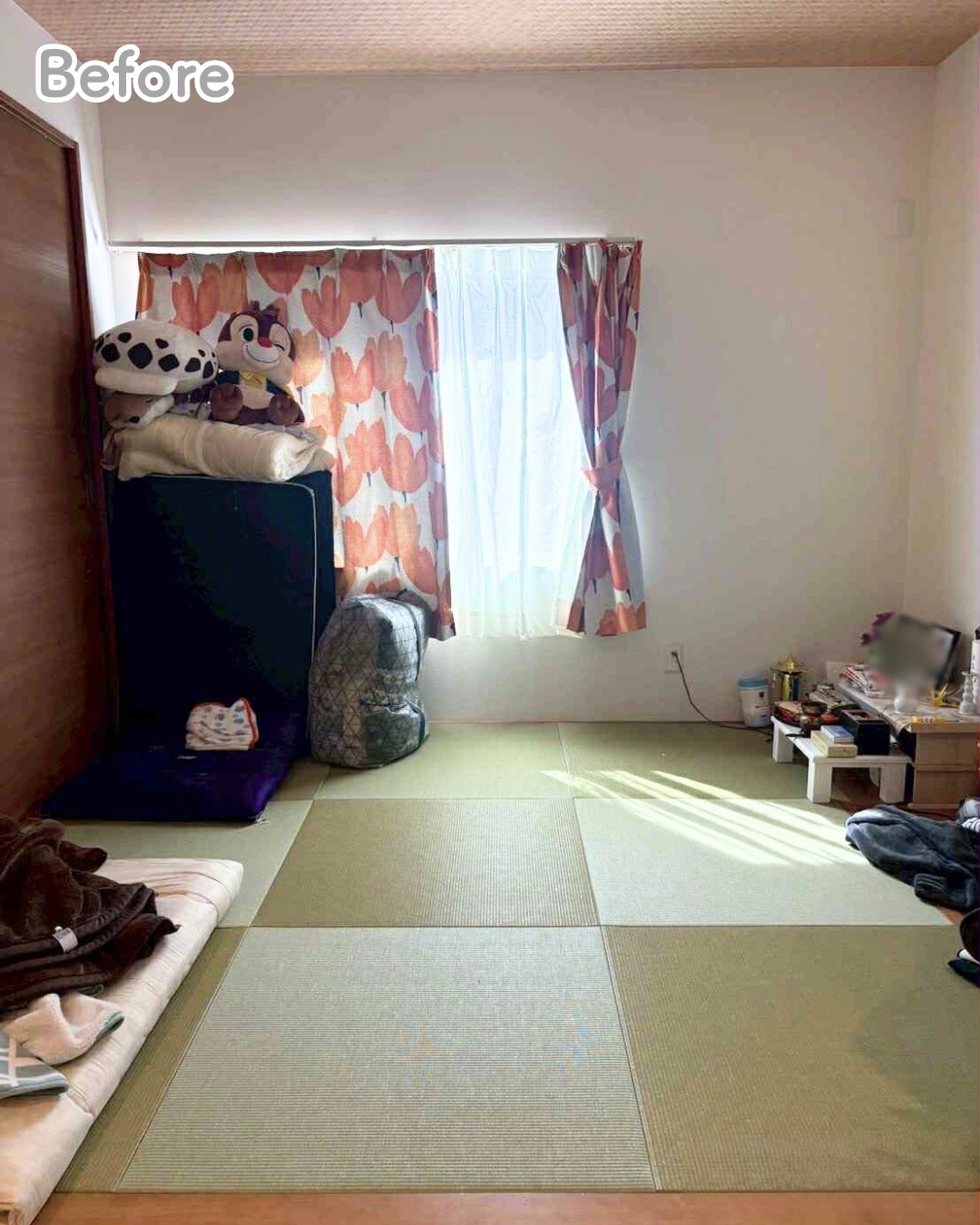 和室手前の机周りも整理収納! 和室の押し入れ奥にあった三段BOXを活用して書類や本を収納しました。