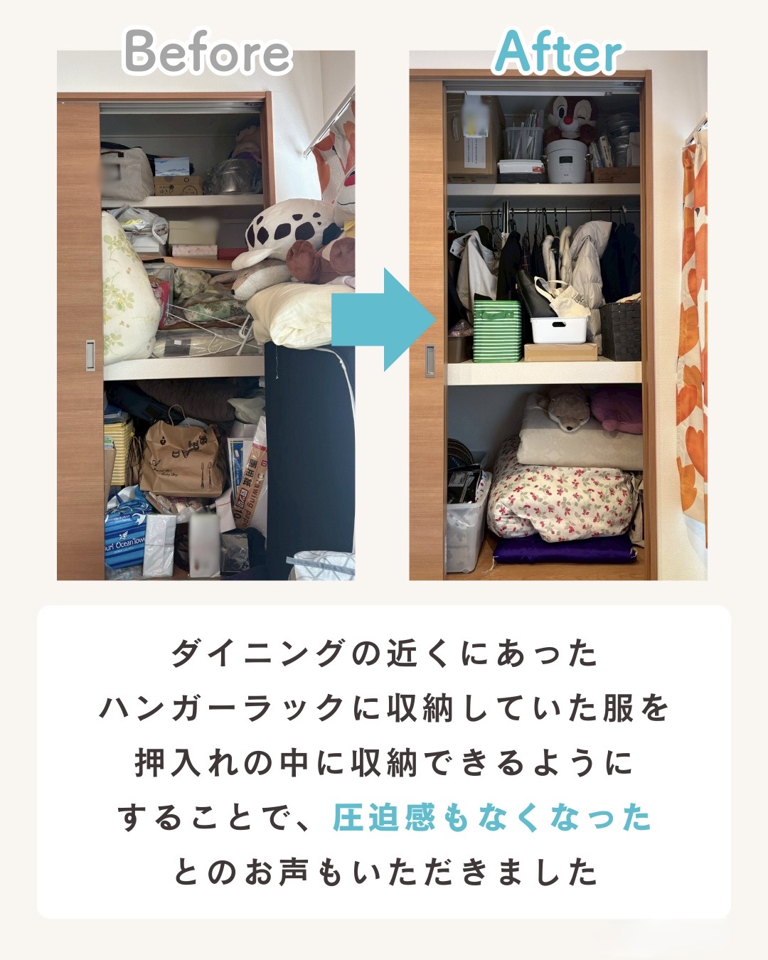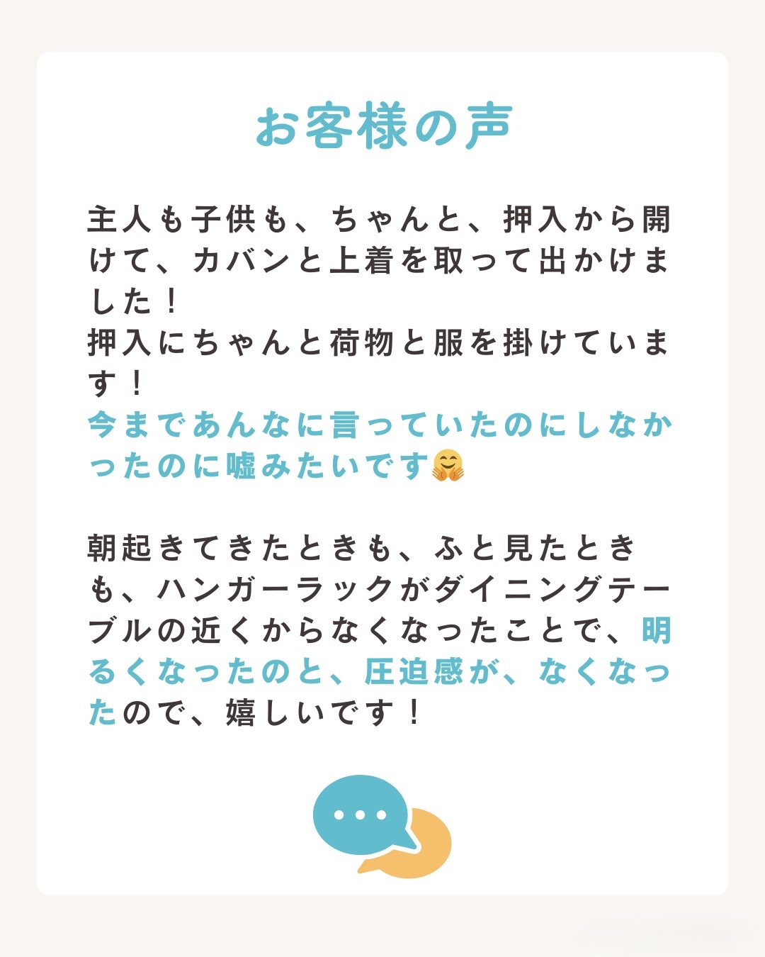 押し入れを家族みなさんのアウターや鞄置き場にした後のお客様のご感想はこちらです。