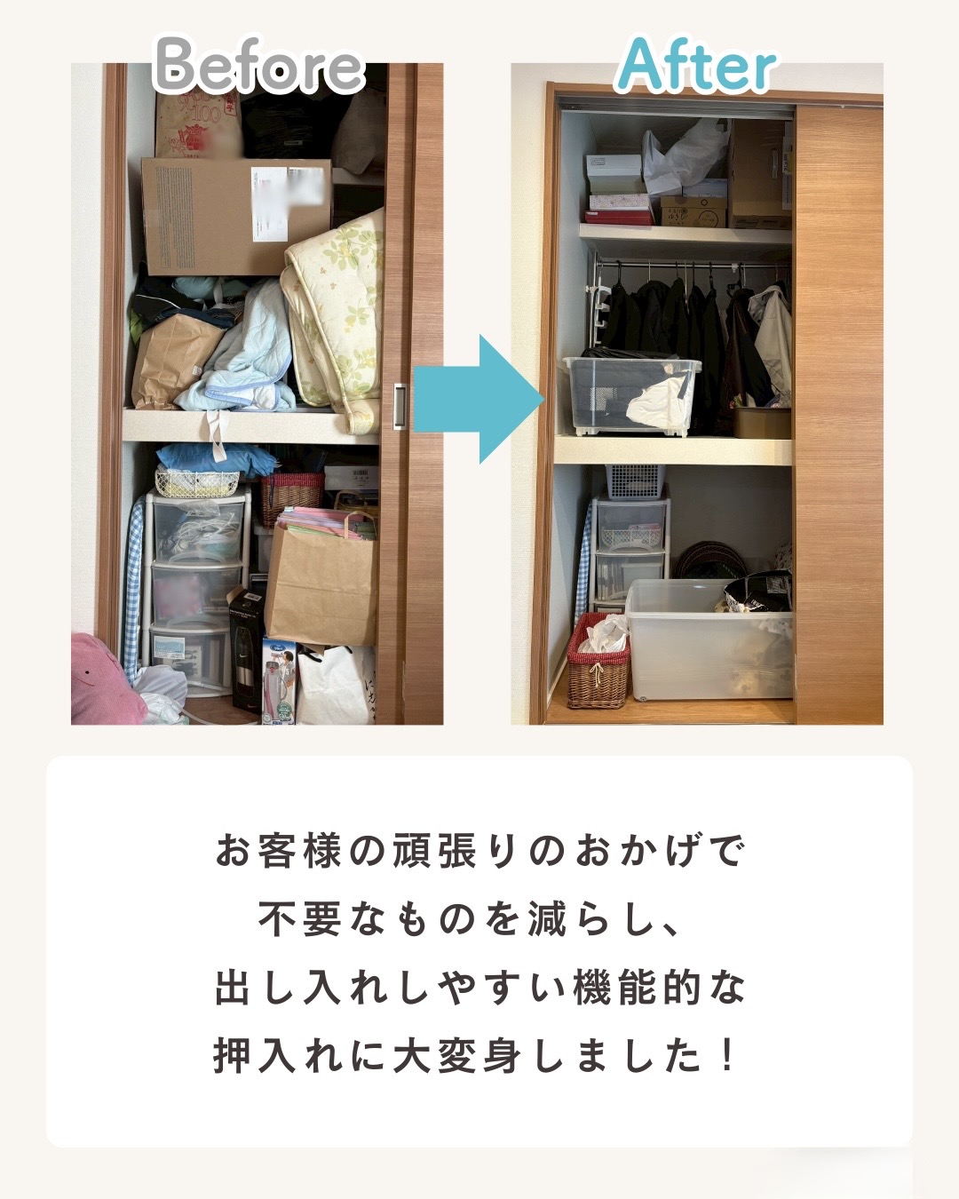押し入れを使うにあたり、ご依頼主様(奥様)は、全ての物と向き合い、もう使わないと判断された物はどんどん処分されました。