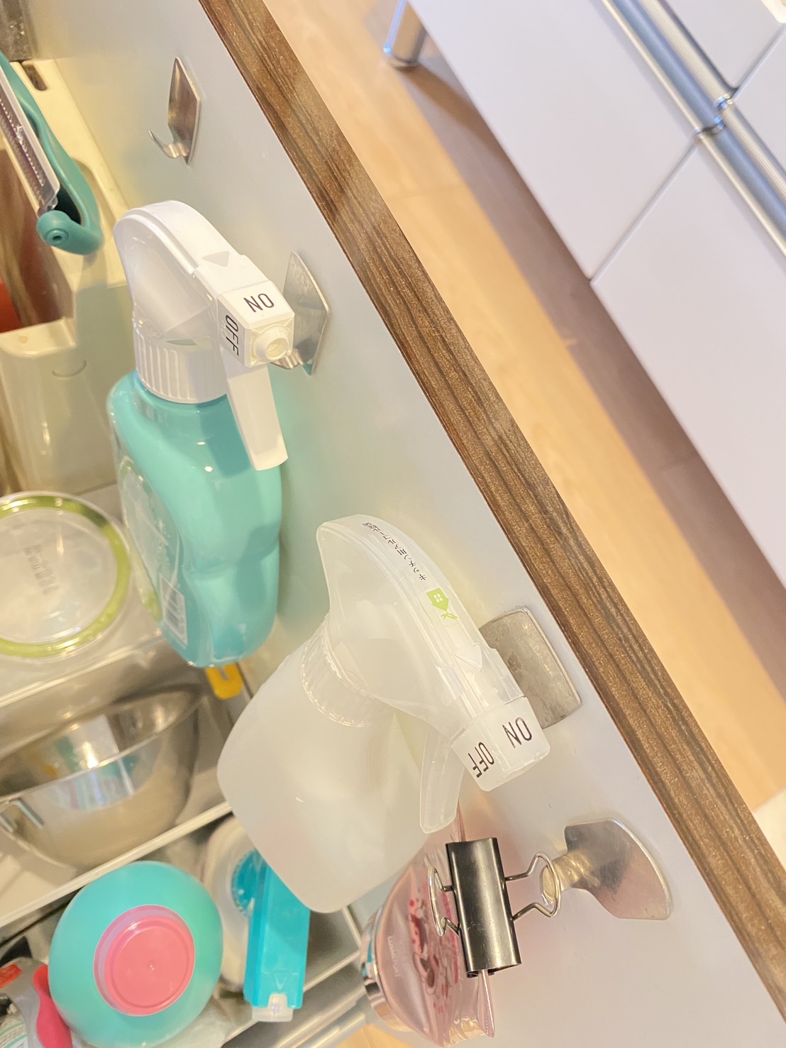 毎日何度も使うキッチン台やダイニングテーブルを拭く時に使う除菌アルコールを掛けています(透明のスプレーボトル)