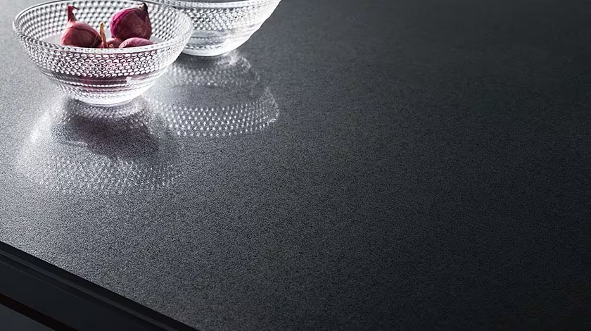 濃色カウンターの弱点である、傷の目立ちやすさや白化を回避するため、一般的な人造大理石 の配合を変えることで表面を硬くし(鉛筆硬度7H以上)、エンボス加工を施すことで機能面・ テクスチャー感の両面をアップされています。最近人気のブラックや濃いめグレーのカラー ラインナップがあるため、当社ではオプション仕様にはなりますが、人気があります。