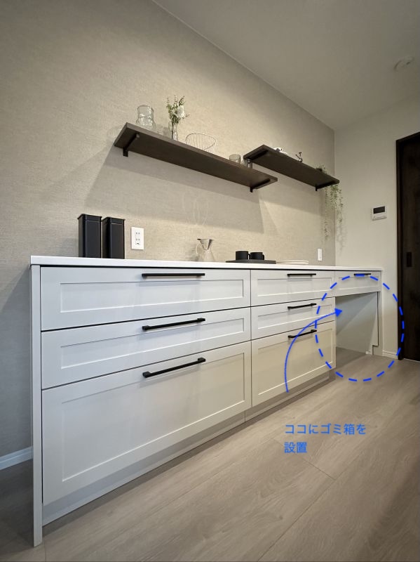 一つ注意点とすればカップボードをゴミ箱スペースとすることで