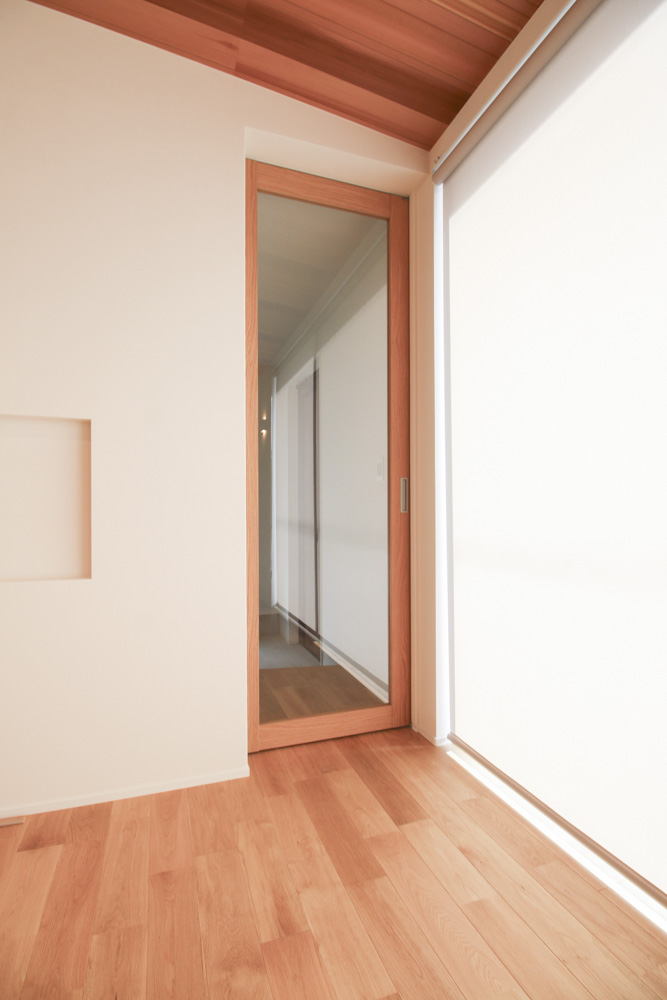 主寝室(床:Will-Suzuki ナラ Nグレード オイル塗装 120mm幅/建具:DAIKEN ハピア モノホワイト/クロス:サンゲツ SP-9733)