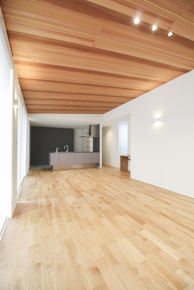 (天井材:朝日ウッドテック the wall 突き板 レッドシダー ランダムピッチ/照明:KOIZUMI AD1187B27) -
