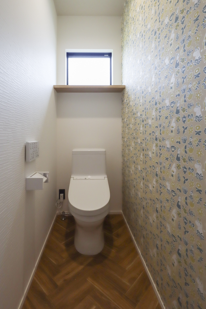 ポップな2階トイレ(便器:TOTO ZJ1/アクセントクロス:サンゲツ FE74380/その他3面壁クロス:サンゲツ FE74181/クッションフロア:サンゲツ HM-10041)